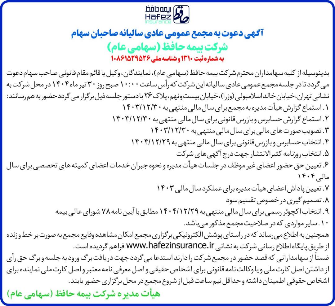 آگهی برگزاری مجمع عمومی عادی  سالیانه صاحبان سهام بیمه حافظ، منتشر شد.